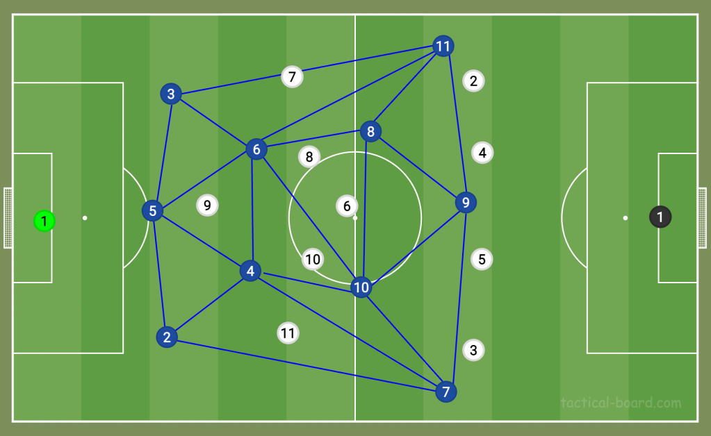 - เป้าหมาย: ยึดครึ่งช่อง (half-space), ดึงแนวรับให้แคบ–กว้างตามจังหวะ แล้วเปิดทางคัทแบ็ก/แทงทะลุ